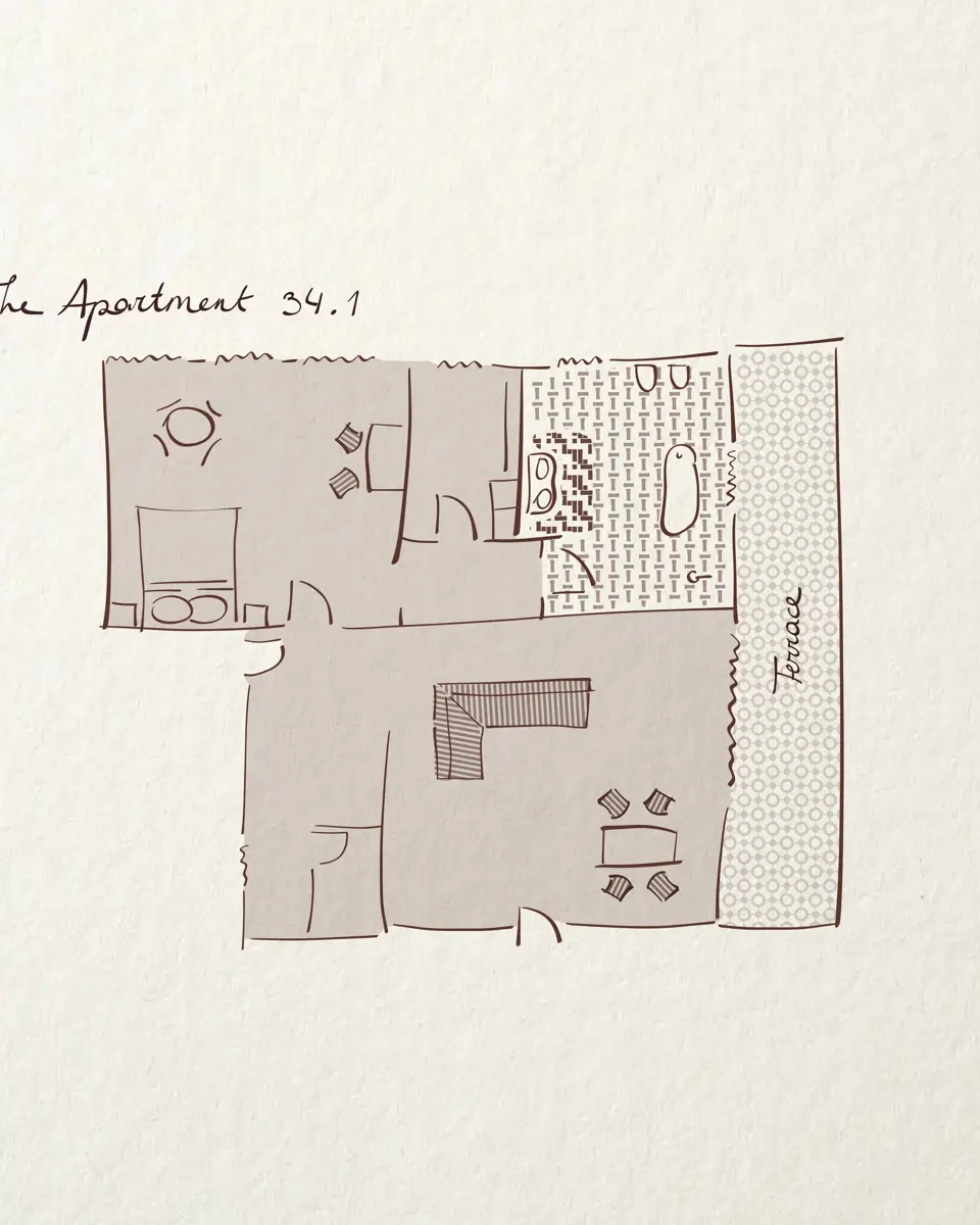 On the top floor, the sprawling two-bedroom apartment comes with its own living and dressing room, large en-suite bathrooms, and an adjoining guest room with a separate entrance, that can be added to create a third bedroom. The surrounding private terrace overlooks the historic Place du Forum, with commanding views of the tree-shaded square and the sky.