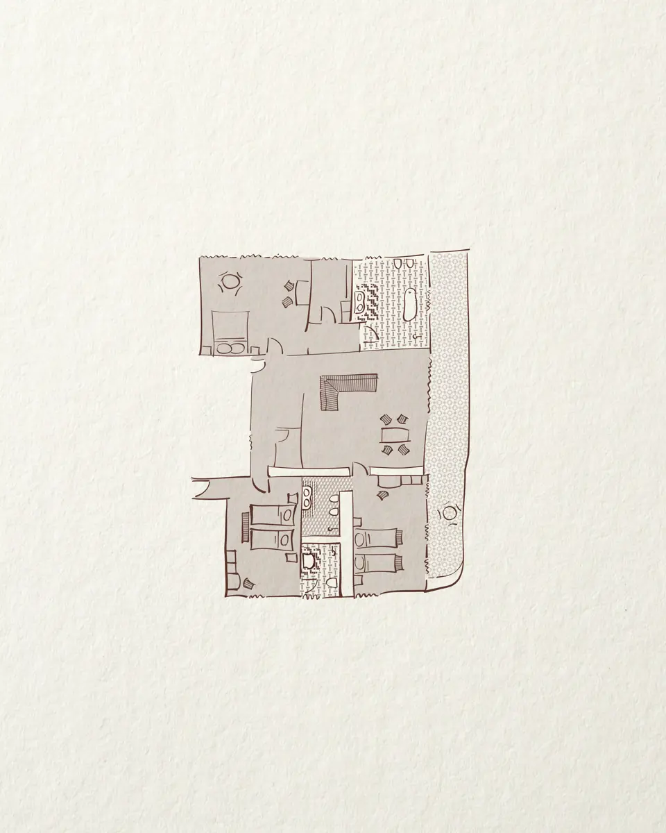 On the top floor, the sprawling two-bedroom apartment comes with its own living and dressing room, large en-suite bathrooms, and an adjoining guest room with a separate entrance, that can be added to create a third bedroom. The surrounding private terrace overlooks the historic Place du Forum, with commanding views of the tree-shaded square and the sky.